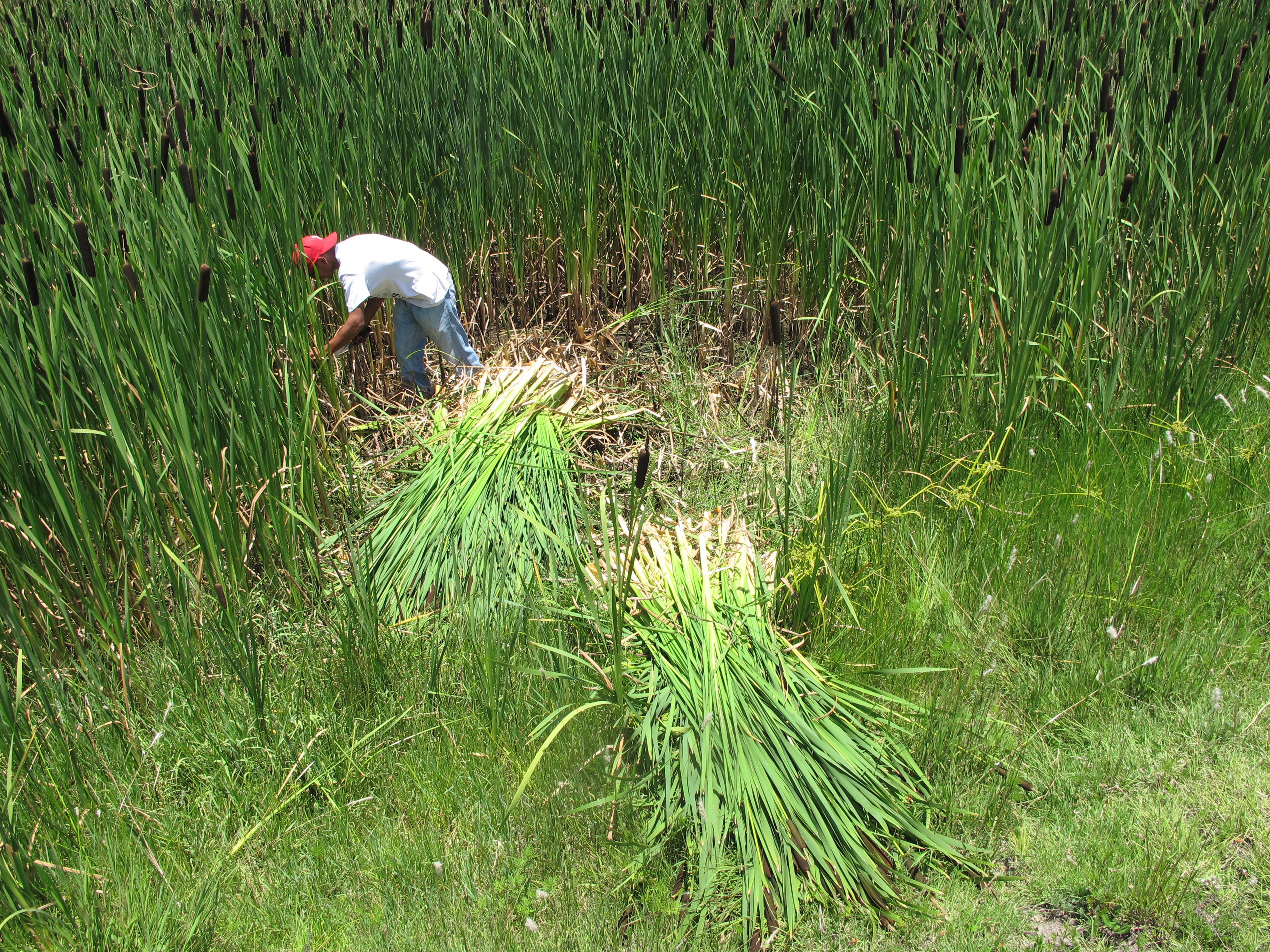 Harvesting tule plant for Liza Grobler woven sculpture.