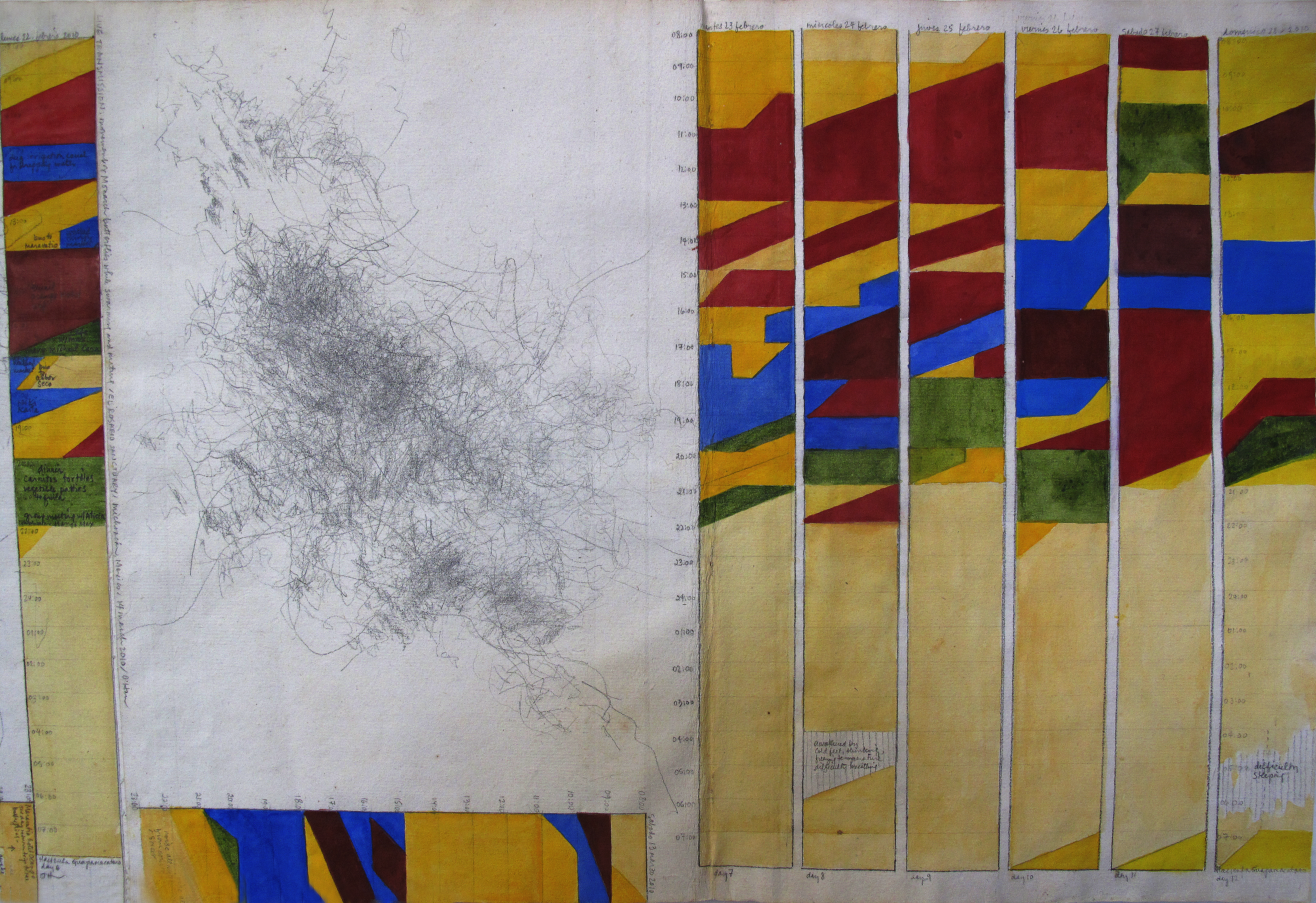 I went to Michoacan to draw the movement of the migrating Monarch butterflies. Ten days before I got there, a terrible storm whose heavy rains destroyed villages and homes, took the lives of 41 people, and killed most of the butterflies. During the three weeks I was in the Michoacan area all I found was half of a monarch butterfly wing in a cow pasture. In the Guapamacataro library I found a book of contemporary Mexican poetry and made imaginary drawings of butterflies coupled with Elsa Cross’s poem Disappearances which seemed to speak to the occasion. I also made color coded drawings/accountings of how I spent my time at Guapamacataro. When I returned to Mexico City I learned that in the town of Rosario some butterflies had survived and I returned for a day to do drawings up in the mountains. The ground all the way up was covered by a six inch thick carpet of dead butterflies. I drew living butterflies mating on top of the compost as well as those flying high in the trees to strengthen their wings for the return flight. These drawings are done on the same pages as my time accounting work.