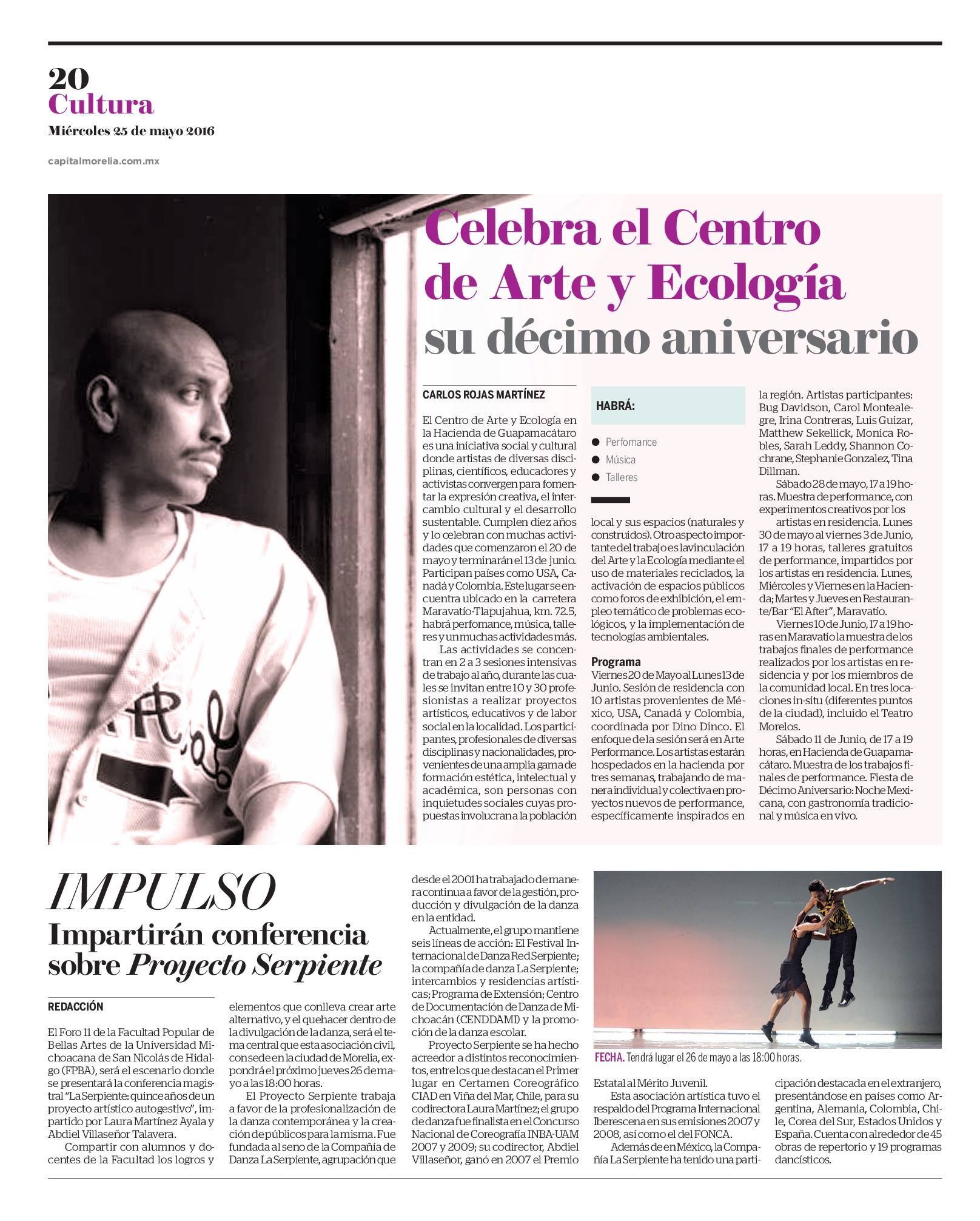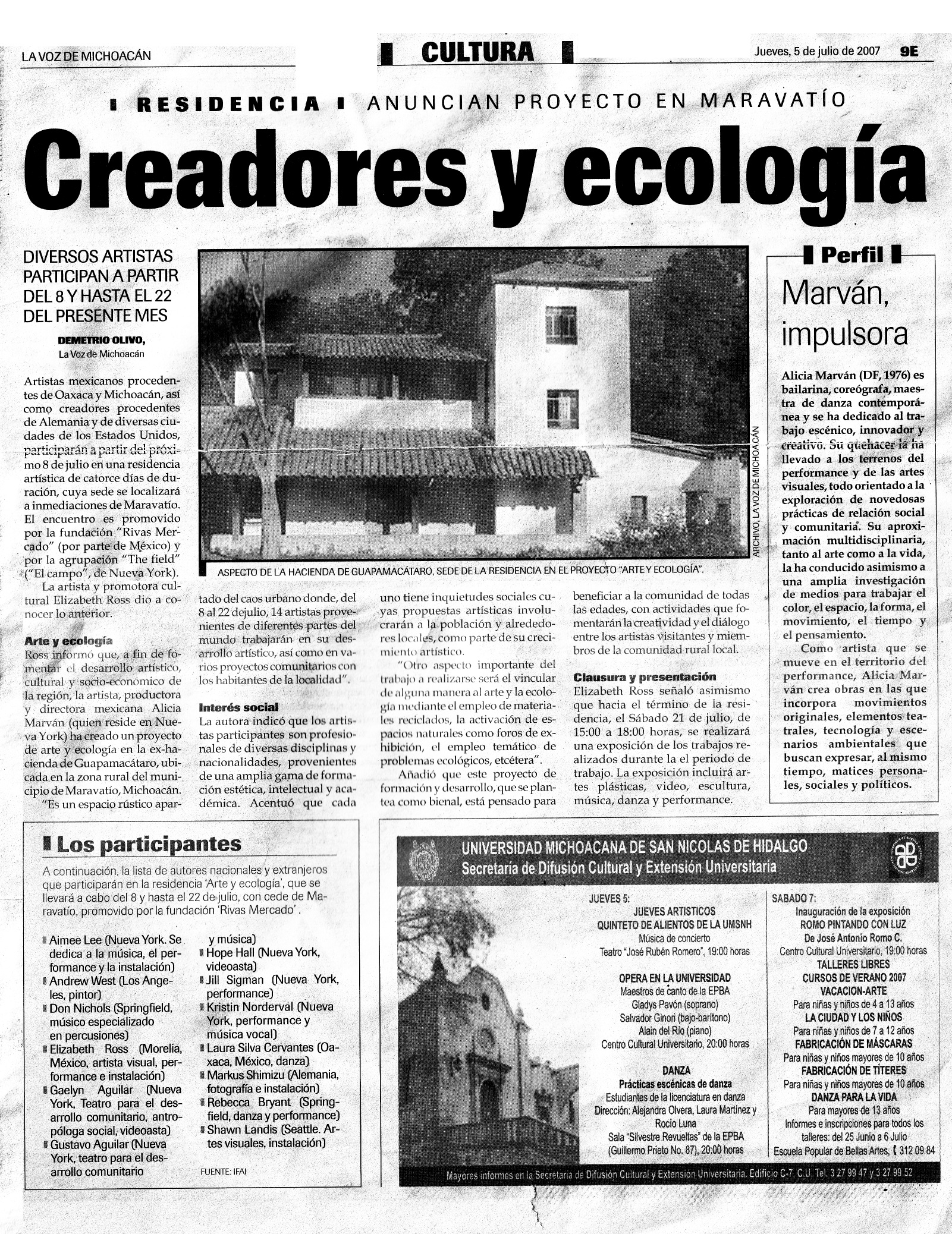 La Voz de Michoacán Newspaper, Morelia, Mexico, July 2007Capital Morelia, May 2016Art Africa, Johannesburg, September 2015Immigration Stories: Mexico-US, Project & Interview by Jackie Neale, February 2018Artvironmentalist Blog, New York, USA, March 30, 2013IndieRocks Magazine, Mexico City, July 2013LINX Blog, Italy, December 2008